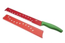 Cut into the juicy flavors of melons with the Kuhn Rikon Nonstick Melon Knife Colori. Fun and functional it's unmistakably designed for use with melons with its green handle and long red blade decorated with a whimsical seed cut-out design. Cleanly and safely slices through thick skins of cantaloupe honeydew or watermelon. Ergonomic handle is designed to help you maintain your grip while applying pressure to cut through tough melon skins.. Seed-shaped cut-outs prevent sticking and help melon slide off the blade easily. Nonstick coating ensures food will release easily from blade. Red safety sheath with its decorative seed-shaped accents coordinates with the whimsical design of the knife and protects blade when not in use